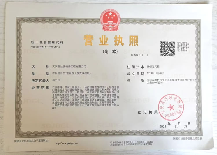 文安縣弘勝鉆井工程有限公司已有15年鉆井勘探歷史,近幾年我們堅(jiān)持不懈得提高技工隊(duì)伍水平,擁有技術(shù)員16名,,員工60余名,公司現(xiàn)在正循環(huán)潛水鉆機(jī)6臺,反循環(huán)4臺,沖擊鉆8臺。